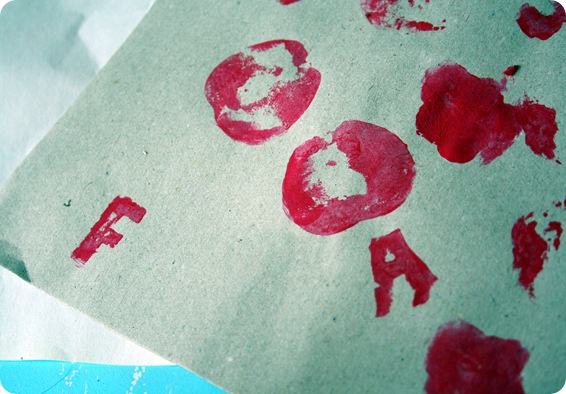 Så males overfladerne på kartoflerne og æblerne, og du kan nu trykke på kort og stof og lave sjove tryk sammen med ungerne… Det kan også være en god måde at øver farver og bogstaver på, hvis børnene er i den alder..